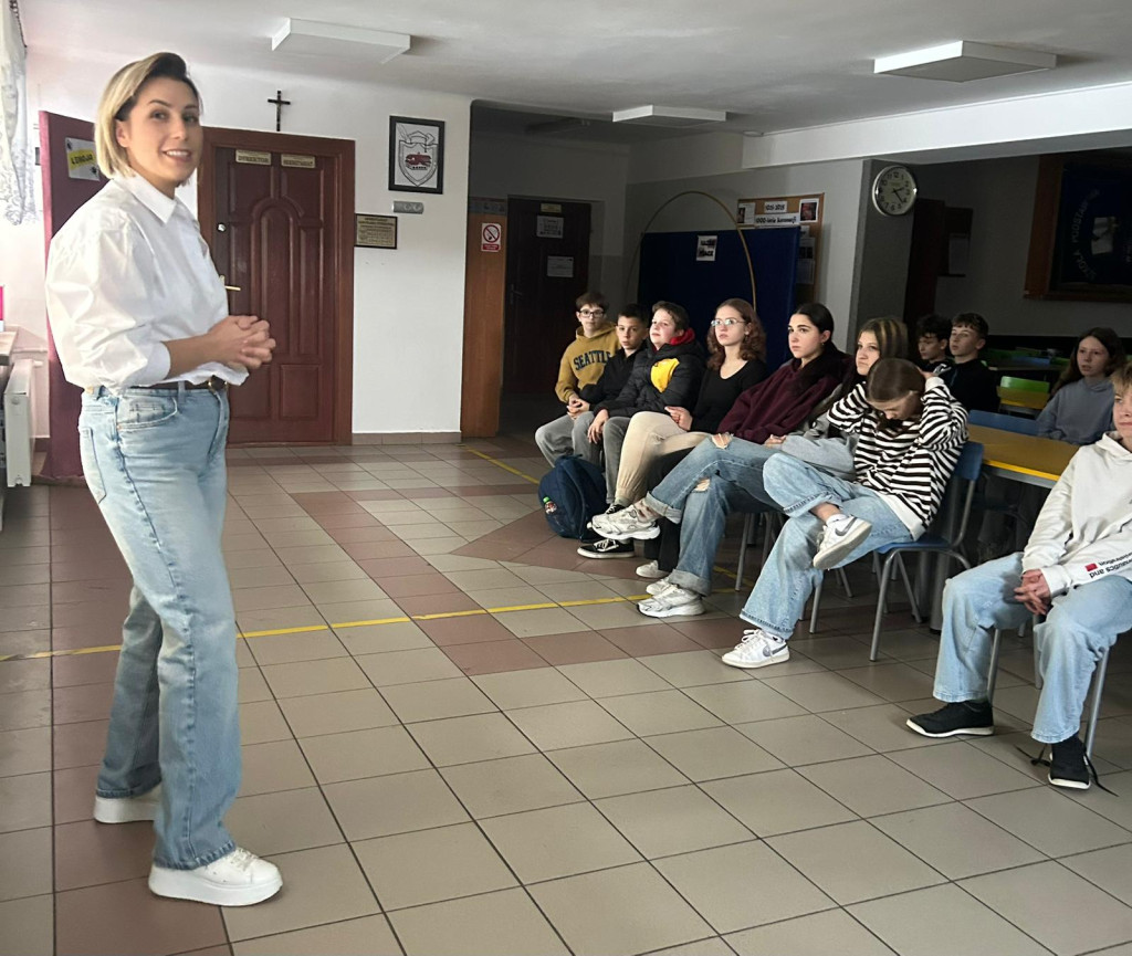 Dnia 24 listopada 2025r pomimo utrudnień związanych z brakiem prądu przez cały dzień, udało nam się zorganizować wyjątkowe spotkanie w ramach Doradztwa zawodowego. Klasy VII i VIII uczestniczyły w rozmowie z panią Eweliną Hebdą, właścicielką siłowni Fit&Joy w Podegrodziu.