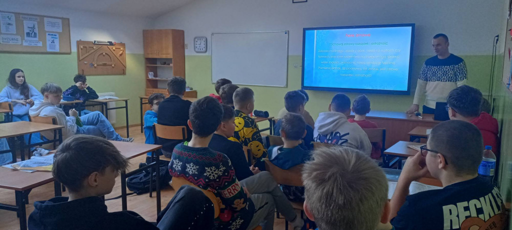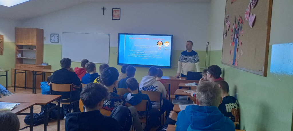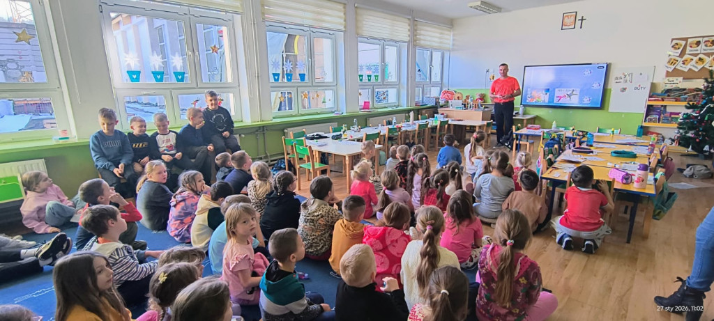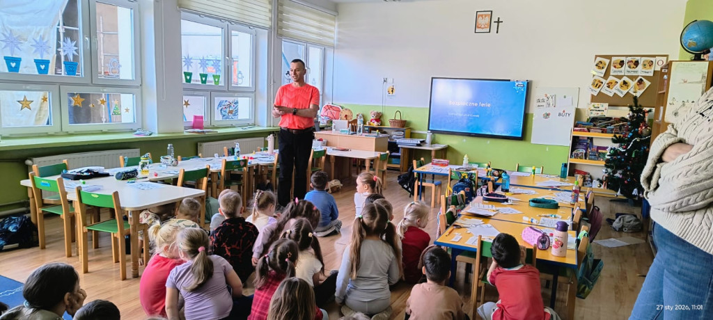 28 stycznia br. pan Piotr Gał przeprowadził zajęcia z dziećmi na temat bezpiecznego spędzania czasu w trakcie ferii. Omówiono zasady bezpiecznej zabawy na śniegu i lodzie, właściwego ubioru w mroźne dni oraz zachowania ostrożności w domu i poza nim. Zwrócono również uwagę na kontakt z nieznajomymi oraz bezpieczne korzystanie z Internetu.