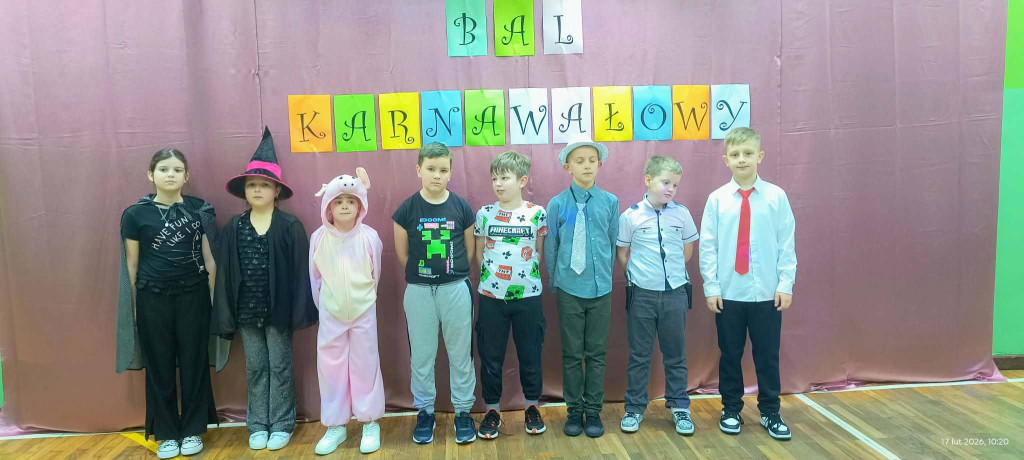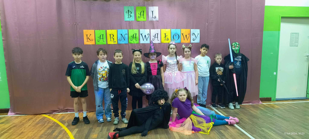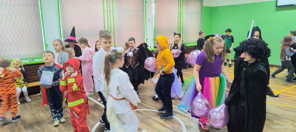 17.02.2026r. odbyła się w naszej szkole zabawa karnawałowa. W tym dniu uczniowie zamienili się w barwne postacie superbohaterów, wróżek i zwierząt. Kolorowe dekoracje, balkonowe girlandy oraz muzyka stworzyły atmosferę radości. Wodzirej - p.Maria Kałuzińska dbała o odpowiedni dobór muzyki, a p. Renata Zagórowska zapewniła liczne zabawy taneczne, ruchowe i konkursy, które integrowały społeczność uczniowską. Pyszny poczęstunek przygotowali nasi kochani rodzice - dziękujemy