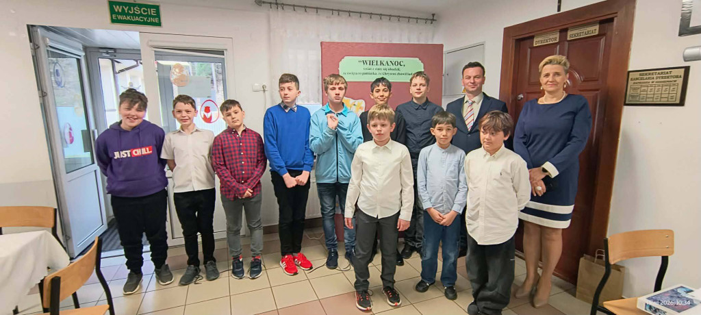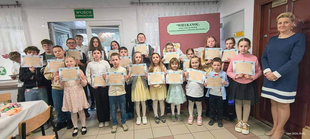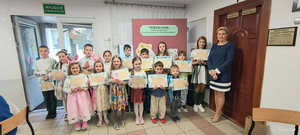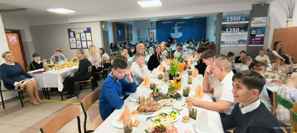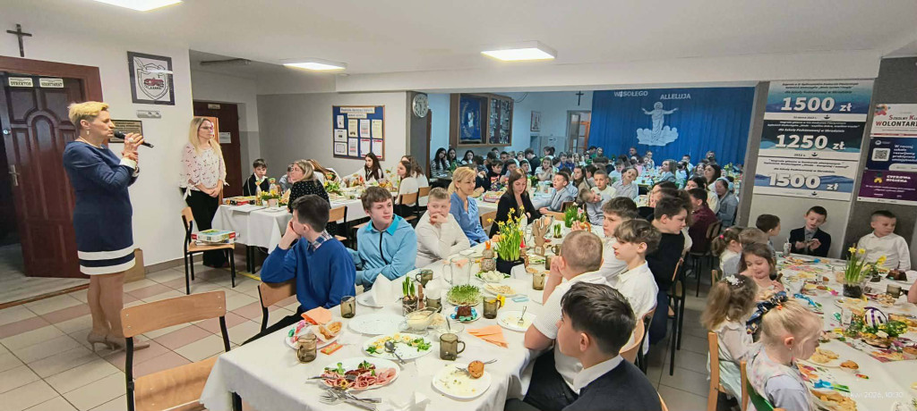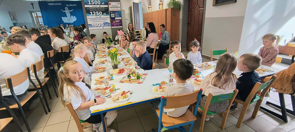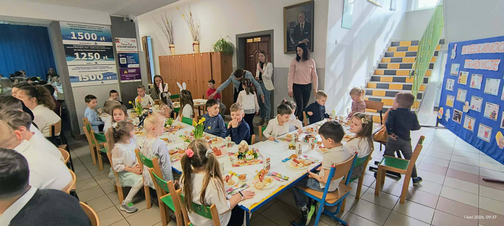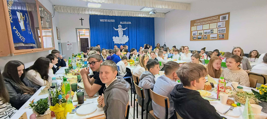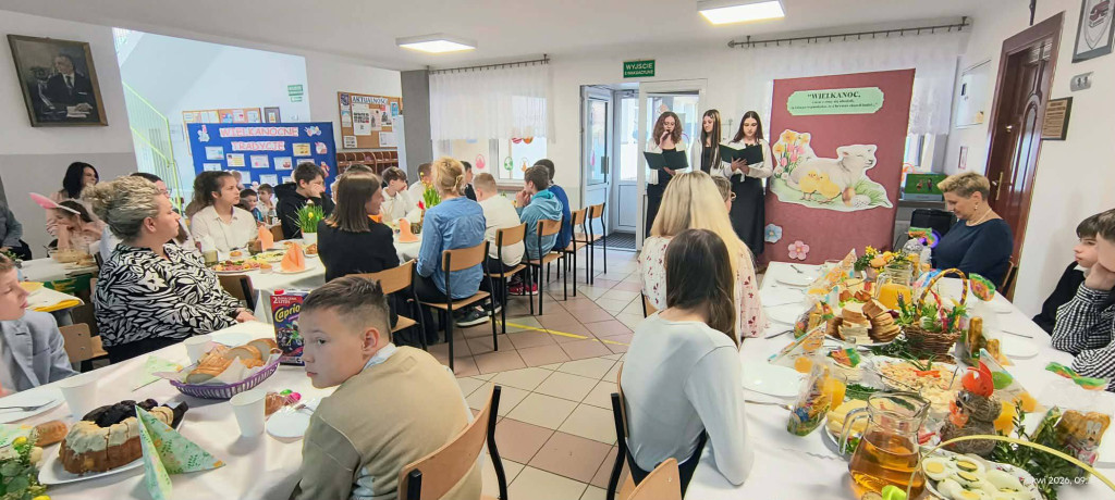 1 kwietnia 2026 r. w naszej szkole odbyło się uroczyste śniadanie wielkanocne, w którym wzięła udział cała społeczność szkolna – uczniowie, nauczyciele i pracownicy oraz rodzice. Spotkanie miało wyjątkowo radosny i świąteczny charakter. Stoły zostały pięknie udekorowane, a na nich znalazły się tradycyjne potrawy wielkanocne. Poczęstunek został przygotowany przez rodziców, którym serdecznie dziękujemy za zaangażowanie i włożony trud. Wspólne świętowanie było okazją do integracji oraz kultywowania tradycji. Pod koniec uroczystości wyróżniono uczniów w szkolnym konkursie na najpiękniejszą kartkę wielkanocną oraz pogratulowaliśmy uczestnikom gminnego konkursu szachowego oraz powiatowego konkursu z pierwszej pomocy. Za uroczystość odpowiedzialna była pani Małgorzata Pierzchała.