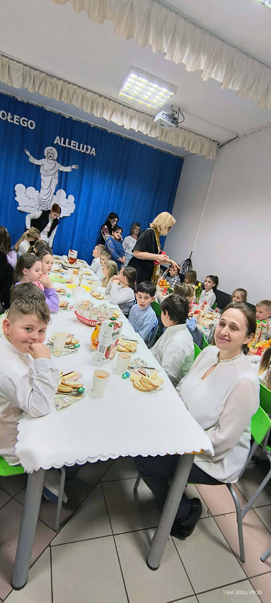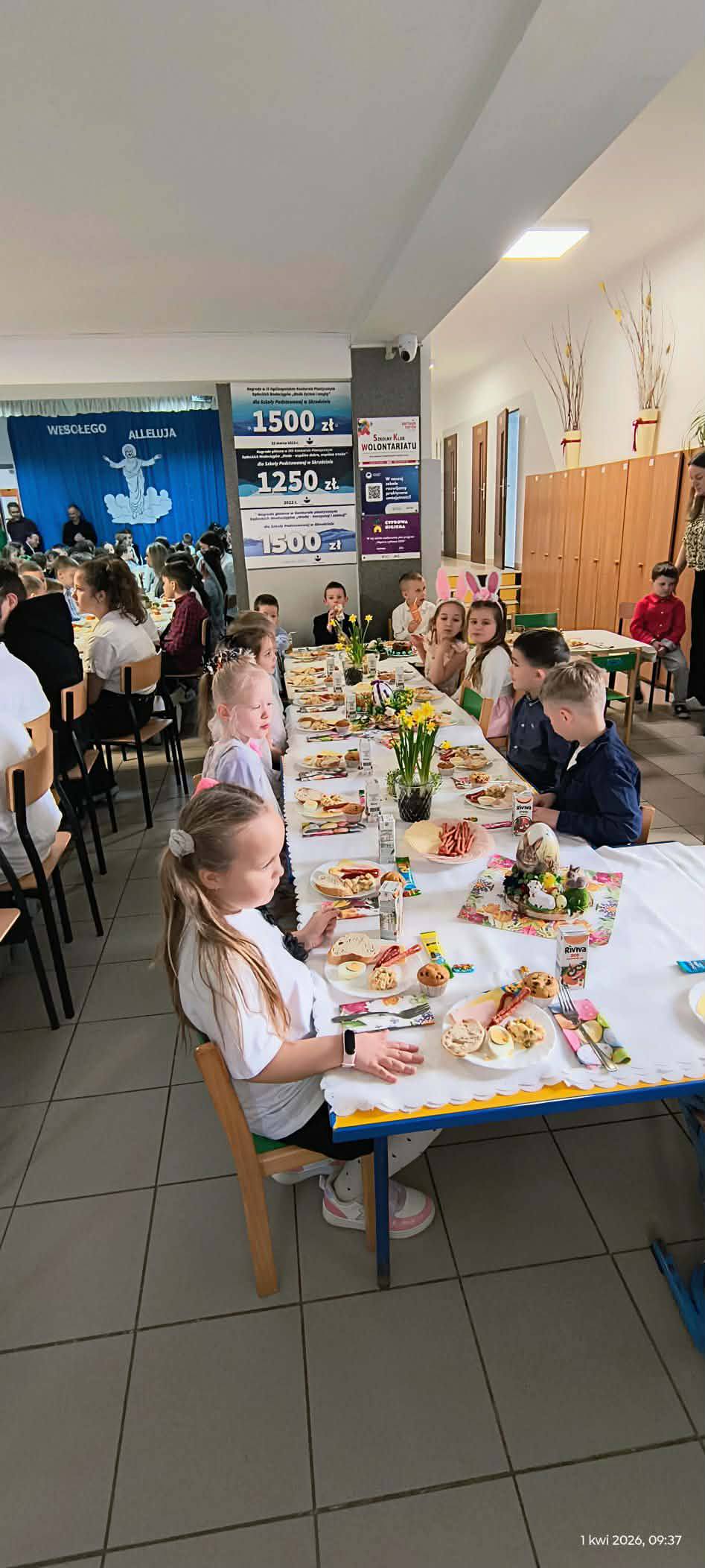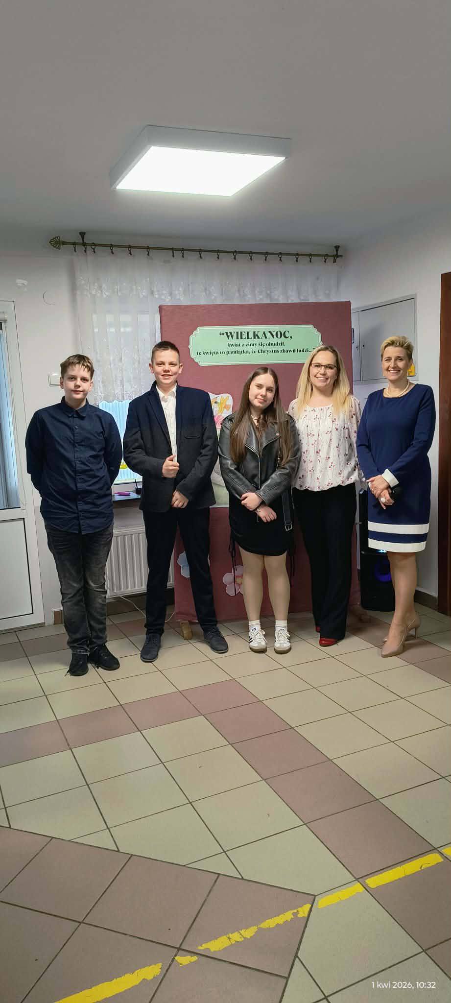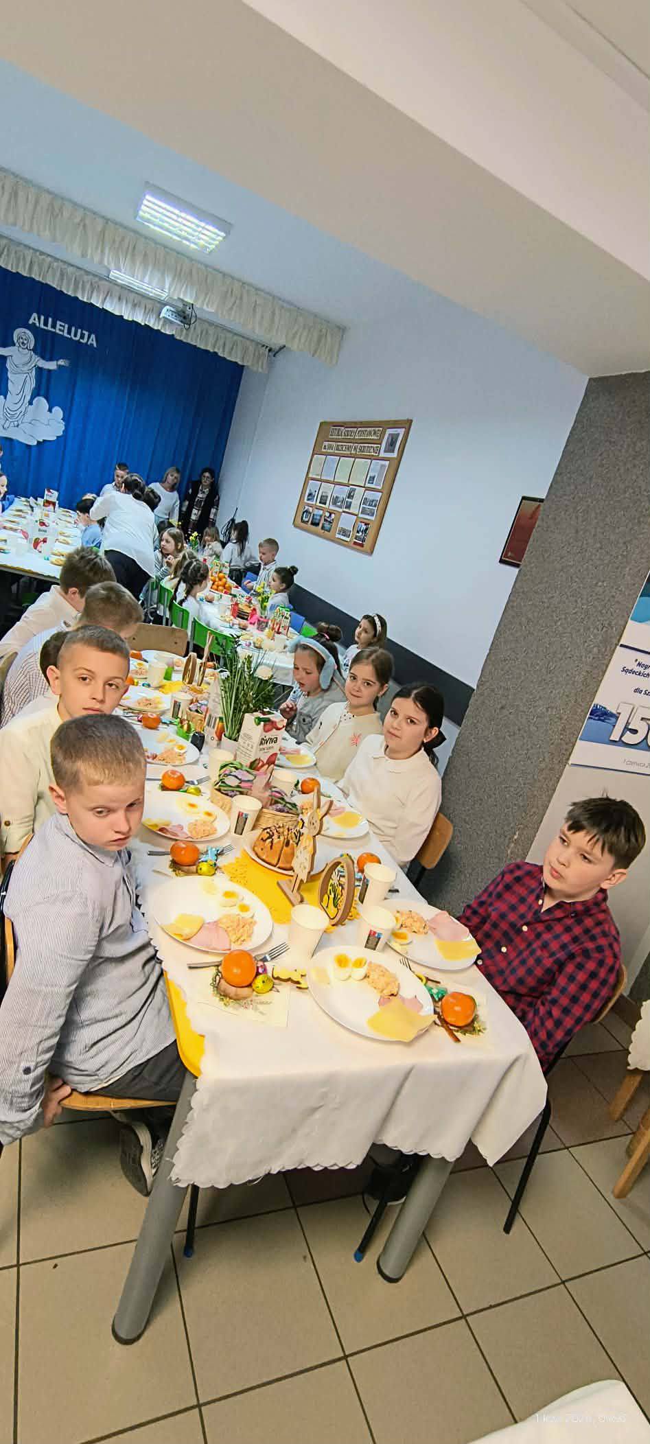 1 kwietnia 2026 r. w naszej szkole odbyło się uroczyste śniadanie wielkanocne, w którym wzięła udział cała społeczność szkolna – uczniowie, nauczyciele i pracownicy oraz rodzice. Spotkanie miało wyjątkowo radosny i świąteczny charakter. Stoły zostały pięknie udekorowane, a na nich znalazły się tradycyjne potrawy wielkanocne. Poczęstunek został przygotowany przez rodziców, którym serdecznie dziękujemy za zaangażowanie i włożony trud. Wspólne świętowanie było okazją do integracji oraz kultywowania tradycji. Pod koniec uroczystości wyróżniono uczniów w szkolnym konkursie na najpiękniejszą kartkę wielkanocną oraz pogratulowaliśmy uczestnikom gminnego konkursu szachowego oraz powiatowego konkursu z pierwszej pomocy. Za uroczystość odpowiedzialna była pani Małgorzata Pierzchała.