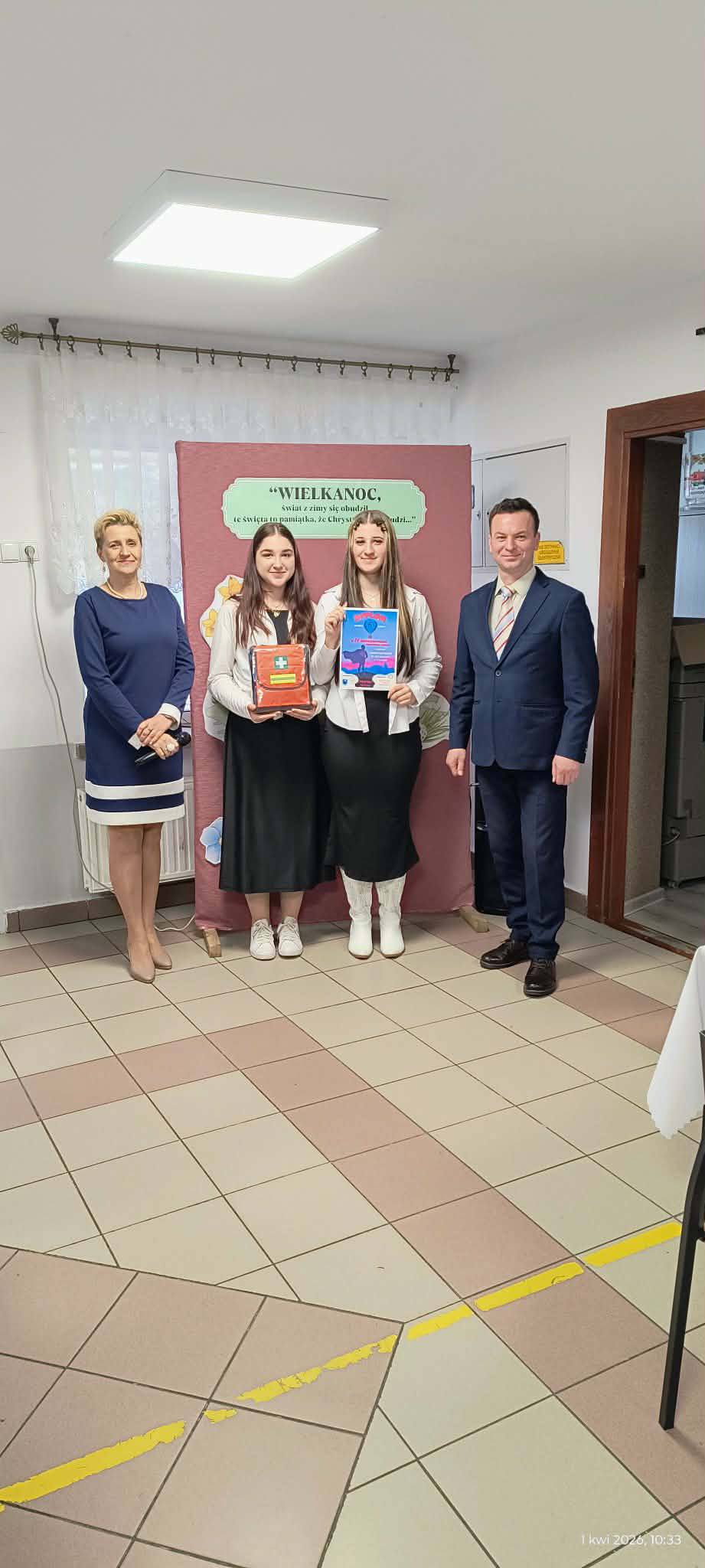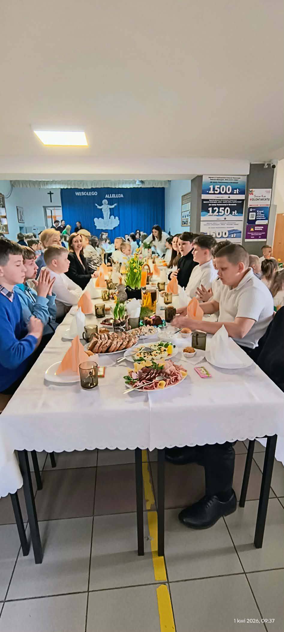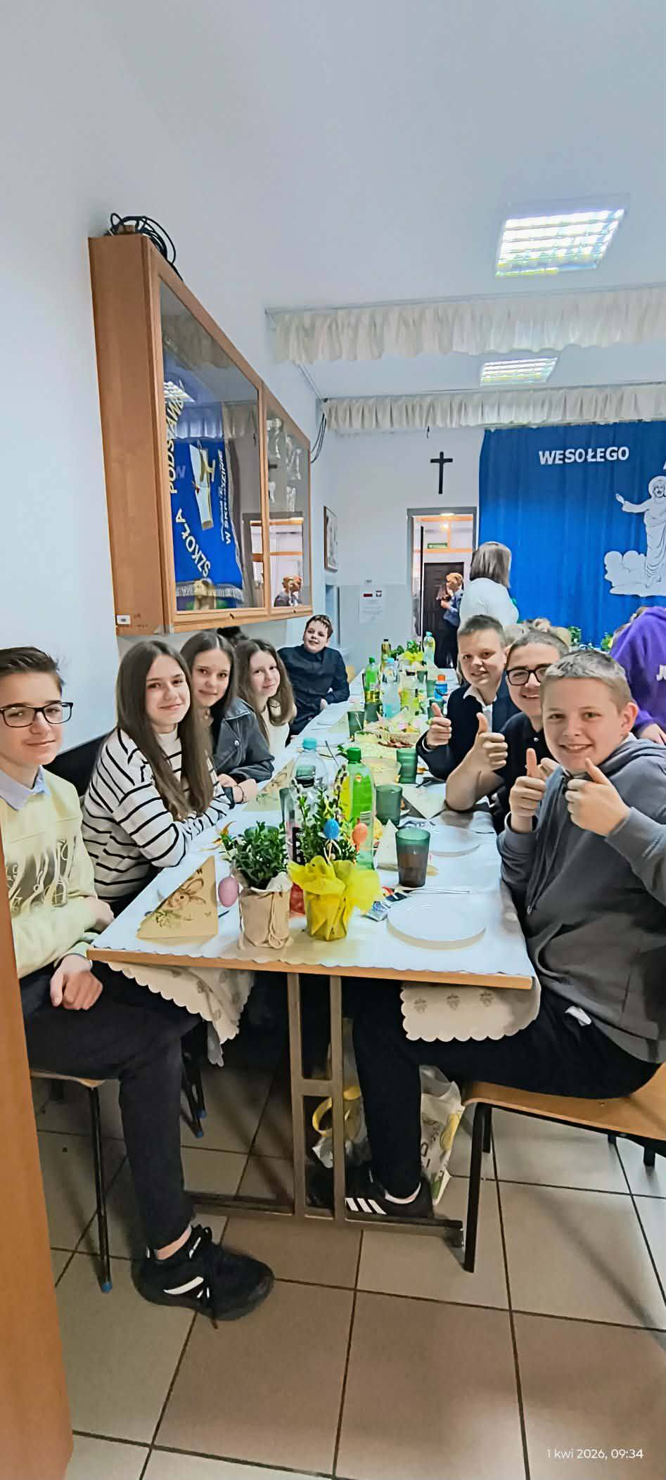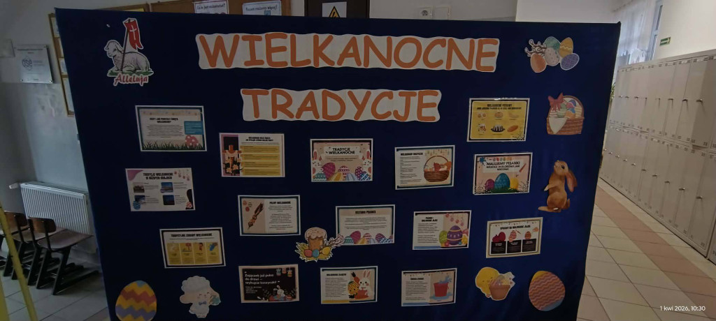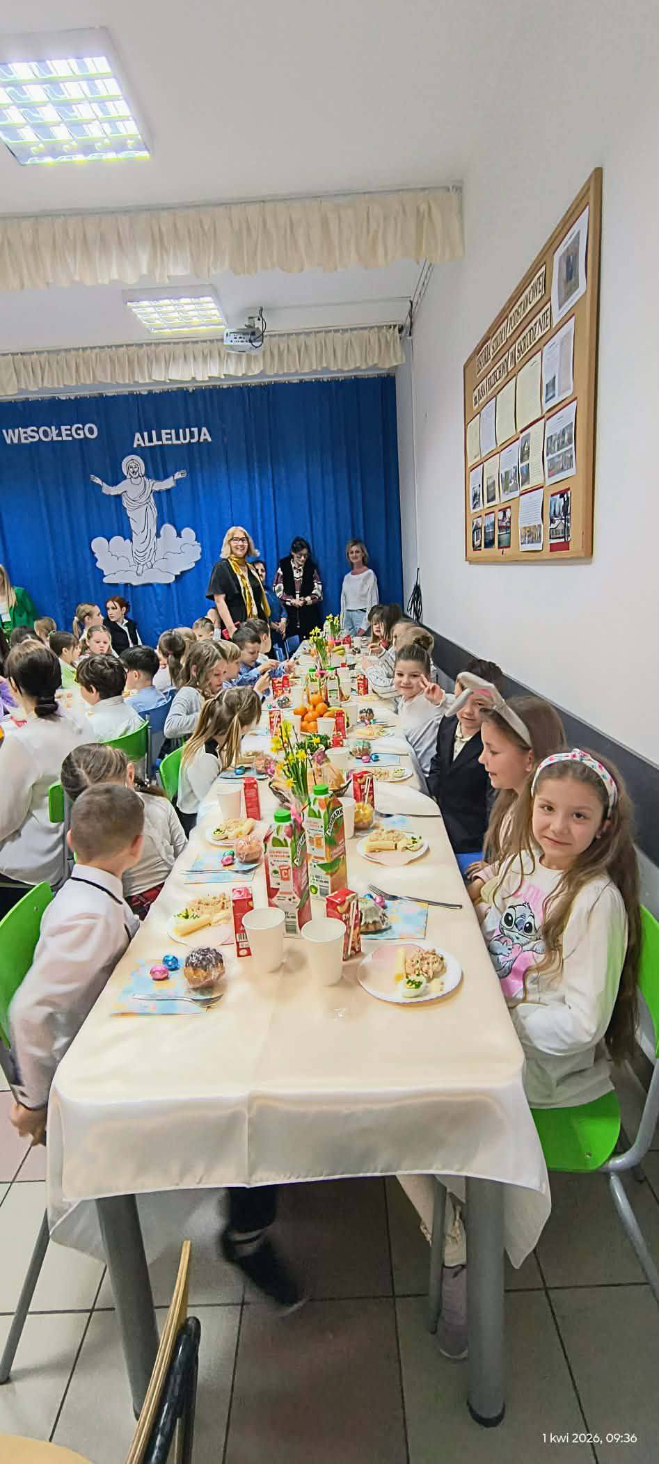 1 kwietnia 2026 r. w naszej szkole odbyło się uroczyste śniadanie wielkanocne, w którym wzięła udział cała społeczność szkolna – uczniowie, nauczyciele i pracownicy oraz rodzice. Spotkanie miało wyjątkowo radosny i świąteczny charakter. Stoły zostały pięknie udekorowane, a na nich znalazły się tradycyjne potrawy wielkanocne. Poczęstunek został przygotowany przez rodziców, którym serdecznie dziękujemy za zaangażowanie i włożony trud. Wspólne świętowanie było okazją do integracji oraz kultywowania tradycji. Pod koniec uroczystości wyróżniono uczniów w szkolnym konkursie na najpiękniejszą kartkę wielkanocną oraz pogratulowaliśmy uczestnikom gminnego konkursu szachowego oraz powiatowego konkursu z pierwszej pomocy. Za uroczystość odpowiedzialna była pani Małgorzata Pierzchała.